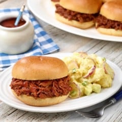 My favorite way to serve this recipe is as BBQ beef sandwiches. Brioche buns, pretzel buns, or even ciabatta rolls are excellent choices that are sturdy enough to hold the meat. Whatever kind of bun you use, brush the insides with butter and lightly toast before filling.