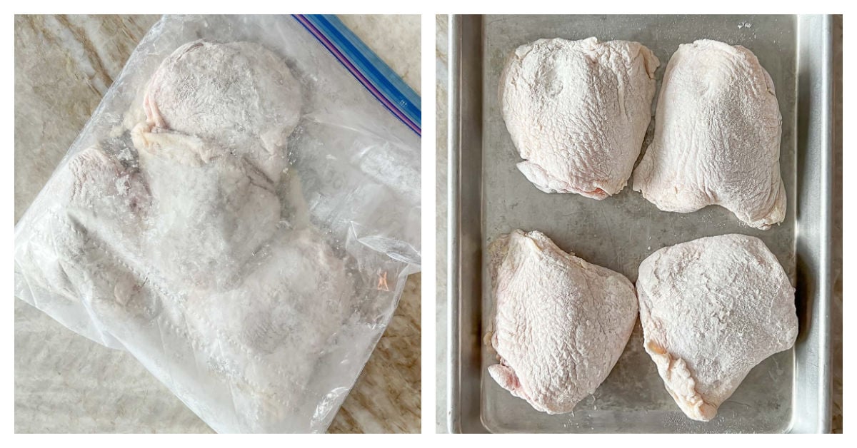 - While oil is heating, place 2 tablespoons flour in a large baggie; add the chicken pieces one at a time and shake to coat chicken with flour. Set aside on a plate.