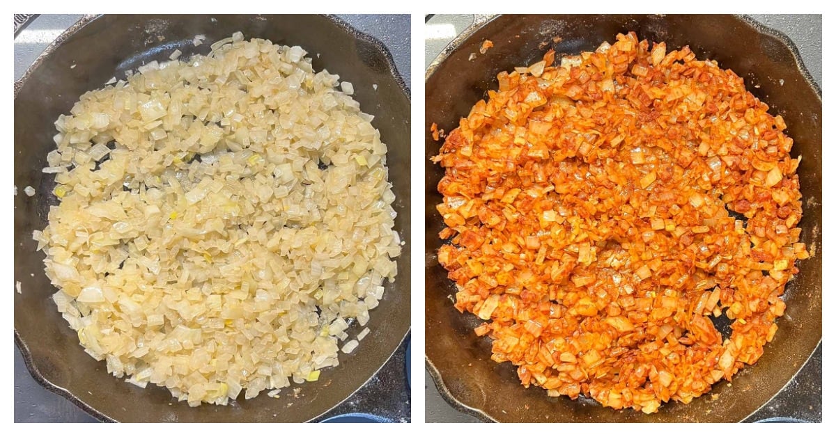 Turn temperature down to medium and add chopped onions. Cook, stirring occasionally, just until soft – around 4 to 5 minutes. Stir in paprika.