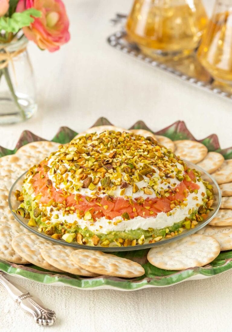 This sophisticated and impressive appetizer is guaranteed to satisfy. Creamy cheese is elevated by the addition of tangy goat cheese, creating a perfect harmony with smoky salmon. Avocado brings a refreshing touch and adds a nice pop of color. Although this smoked salmon appetizer requires some time for preparation and refrigeration, the resulting taste is absolutely worth the effort.