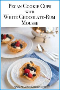 Delicate and elegant Pecan Cookie Cups are filled with scrumptious White Chocolate-Rum Mousse and topped with fresh berries – the perfect light and flavorful dish to end a spring or summer meal!