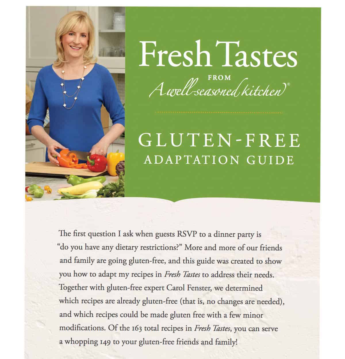 Together with gluten-free expert Carol Fenster, we determined which recipes in my cookbook Fresh Tastes are naturally gluten free (no changes needed), and which recipes can be made gluten free with one or two simple ingredient substitutions. Of the 163 total recipes in the book, this guide shows how 149 can be made or are already naturally gluten free!