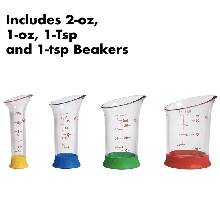 These little mini beakers are perfect for measuring liquids – from 1 teaspoon to 4 tablespoons. The wider top makes for easy filling and spout aids in pouring.