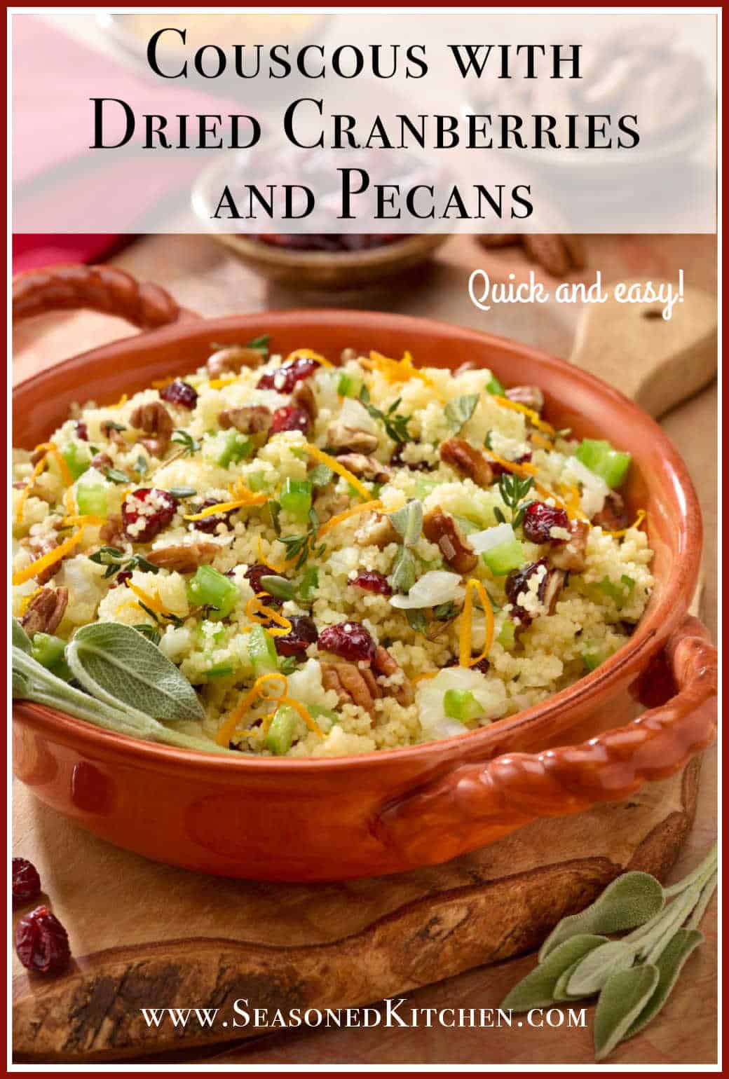 For my Couscous with Dried Cranberries and Pecans, I combine couscous with sautéed onion and celery, along with dried cranberries, toasted pecans, orange zest, thyme, sage and cinnamon. The resulting side dish is savory with a tad of sweetness and a bit of crunch – and it’s perfect for Thanksgiving!