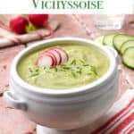 This Cucumber Leek Vichyssoise is a classic soup with a twist. Vichyssoise (see definition below) is a chilled soup traditionally made with leeks, potatoes and cream, and served cold with a garnish of chives or other herbs. In this recipe, I add the refreshing flavors of cucumber and lemon juice to the mix, along with baby spinach, garlic and onion. These additions add depth to the combined soup’s flavor – garlic adds a bit of a bite, baby spinach earthiness and color, and fresh lemon juice brightens everything up. Finally, a garnish of thinly sliced radishes adds contrasting color and a bit of crunch!
