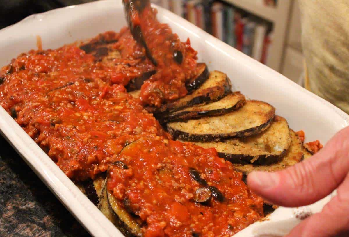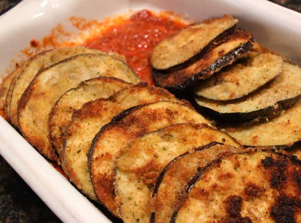 - In a 13- by 9-inch baking dish, spread marinara sauce to cover the bottom. Layer the eggplant like shingles in two rows, with each row going in an opposite direction (you may be able to fit in three rows, depending on the size of your eggplant).