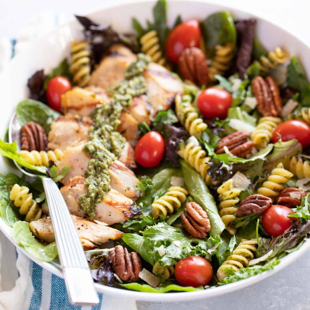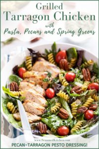 OK, so this recipe’s name is a mouthful (and I didn’t even include the Pecan-Tarragon Pesto Dressing in the name!) which is consistent with the salad itself, as it’s a mouthful of flavors. First, there’s the Grilled Tarragon Chicken. Butterflied chicken breasts are marinated in a tangy mixture of olive oil, vinegar, fresh tarragon, rosemary and garlic. After grilling, they are sliced and placed atop a colorful and texture-rich salad of rotini pasta, baby spring greens, tomatoes and pecans. To finish it off, there’s this amazing Pecan-Tarragon Pesto Dressing.