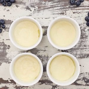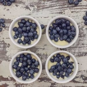 Individual Blueberry Cakes are a great last-minute dessert you can pull together in less than 15 minutes (prep time) on those nights you have unexpected guests – or just want to treat yourself! Calling for only 7 ingredients that you are likely to have on hand in your pantry (flour, sugar, baking powder, salt, milk, butter and, yes, blueberries), they are super easy to prepare. No electric mixer or blender required – all you need is two mixing bowls, a spoon, a whisk and some ramekins. That’s it! Easy, delicious and elegant – what more could you ask for?