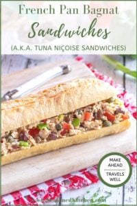 Pan Bagnat can be prepared up to 24 hours ahead, making it perfect for busy day lunch or dinner. Serve it with arugula or spinach salad. It also travels well, making it perfect for potlucks and picnics, too!