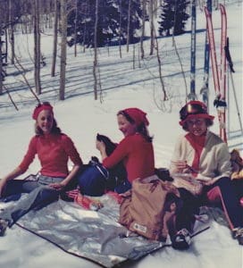 In fact, here’s an old photo of mom, me (left) and my childhood best friend Katey Hartwell enjoying one of mom’s gourmet picnic lunches, back when I was in high school. We had taken a break while skiing on Rabbit Ears Pass in Colorado: