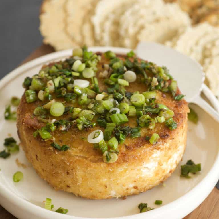 Cheese seems to be a universal crow-pleasing appetizer. This quick and easy Sautéed Brie with Green Onion recipe was a favorite of my mom – in fact, it was one of her creations. It’s super delicious, and takes standard Brie cheese up a few notches by breading it, sautéing it in butter, and topping it with sautéed green onions. You’ll be amazed at how much flavor there is in this 5-ingredient dish! With this recipe, you can put together a super scrumptious and pretty appetizer in less than 10 minutes from beginning to end.