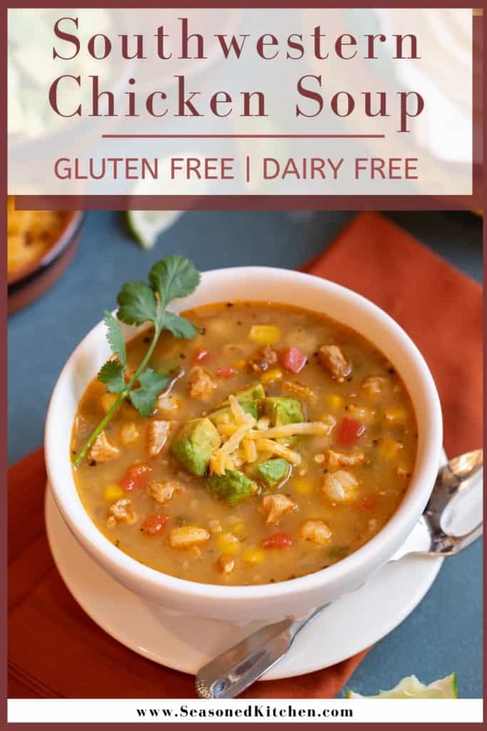 This Southwestern Chicken Soup has a slightly spicy, uber-flavorful broth combined with tender chicken, onion, peppers, garlic, lots of spices (cumin, chili powder, coriander), corn and a surprise ingredient – hominy! It’s finished with an Avocado-Cheese garnish that both adds color and ensures this scrumptious soup will satisfy any appetite.