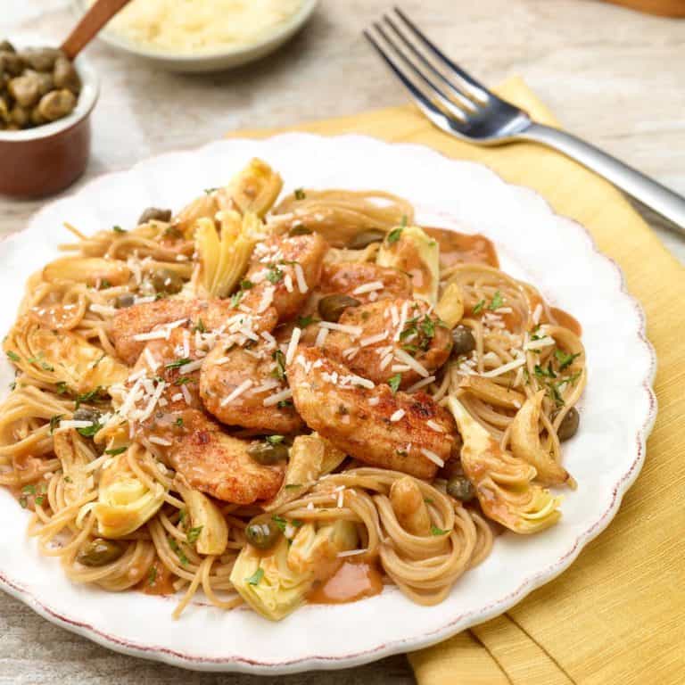 Angel Hair with Chicken and Artichoke-Caper Sauce is a light and healthy pasta dish that’s chock-a-block full of flavor.
